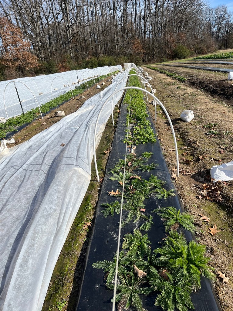 Cool flowers in our zone are typically planted in the fall, develop roots, stay somewhat static through the dead of winter and are first to bloom in the Spring. However, we have had a warm winter so far so the plants have grown. Now it’s supposed to be a low in the teens several night next week. This calls for leaf mulch and double row covers. And I hope they will stay in place with all the high winds predicted! Getting to work to get this all done!